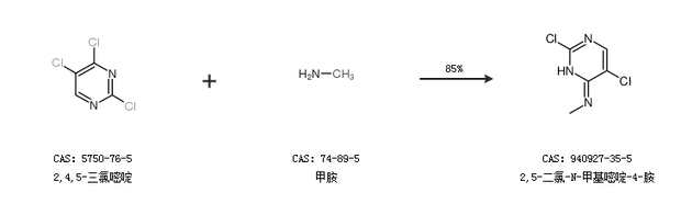 1.通过2,4,5-三氯嘧啶和甲胺合成2,5-二氯-N-甲基嘧啶-4-胺,收率约85%;