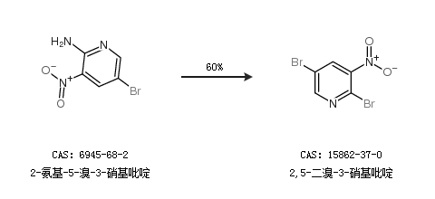 2.通过2-氨基-5-溴-3-硝基吡啶合成2,5-二溴-3-硝基吡啶,收率约60%;
