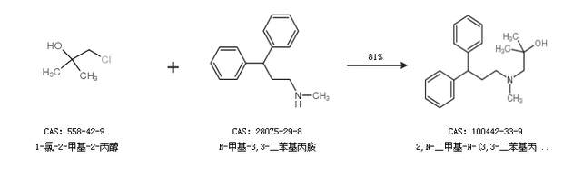 1.通过1-氯-2-甲基-2-丙醇和N-甲基-3,3-二苯基丙胺合成2,N-二甲基-N-(3,3-二苯基丙基)-1-氨基-2-丙醇,收率约81%;
