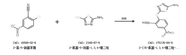 1.通过2-氯-5-硝基苯腈和2-氨基-5-巯基-1,3,4-噻二唑合成2-[(5-氨基-1,3,4-噻二唑-2-基)硫代]-5-硝基苯甲腈,收率约69%;
