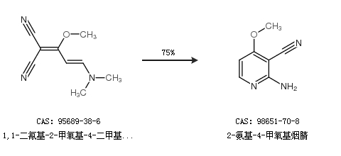 1.通过1,1-二氰基-2-甲氧基-4-二甲基氨基-1,3-丁二烯合成2-氨基-4-甲氧基烟腈,收率约75%;