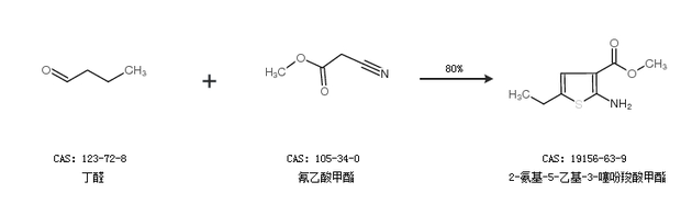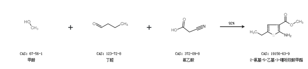 2.通过甲醇、丁醛和氰乙酸合成2-氨基-5-乙基-3-噻吩羧酸甲酯,收率约92%;