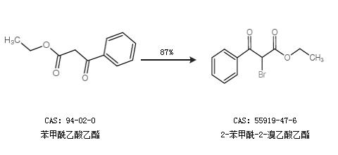 2.通过苯甲酰乙酸乙酯合成2-苯甲酰-2-溴乙酸乙酯,收率约87%;