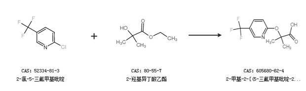 1.通过2-甲基-2-[[5-(三氟甲基)吡啶-2-基]氧基]丙酸乙酯合成2-甲基-2-[(5-三氟甲基吡啶-2-基)氧基]丙酸