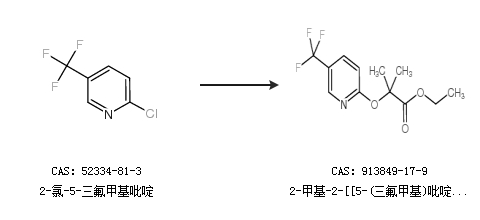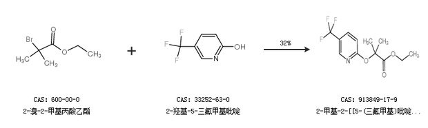 1.通过2-溴-2-甲基丙酸乙酯和2-羟基-5-三氟甲基吡啶合成2-甲基-2-[[5-(三氟甲基)吡啶-2-基]氧基]丙酸乙酯,收率约32%;