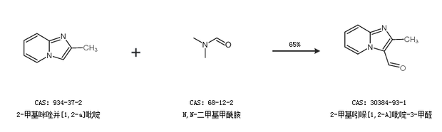 1.通过2-甲基咪唑并[1,2-a]吡啶和N,N-二甲基甲酰胺合成2-甲基吲哚[1,2-A]吡啶-3-甲醛,收率约65%;