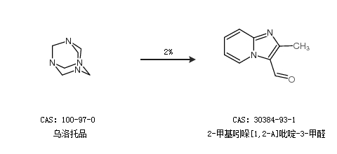 2.通过乌洛托品合成2-甲基吲哚[1,2-A]吡啶-3-甲醛,收率约2%;