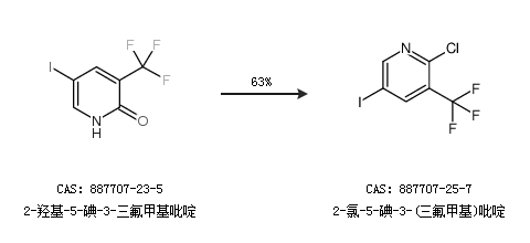1.通过2-羟基-5-碘-3-三氟甲基吡啶合成2-氯-5-碘-3-(三氟甲基)吡啶,收率约63%;