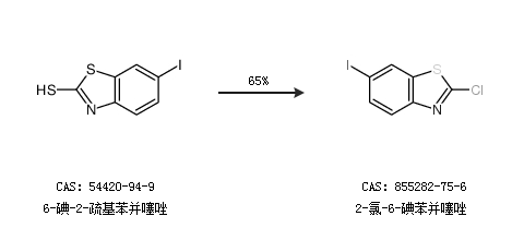 1.通过6-碘-2-疏基苯并噻唑合成2-氯-6-碘苯并噻唑,收率约65%;