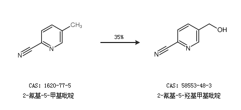 1.通过2-氰基-5-甲基吡啶合成2-氰基-5-羟基甲基吡啶,收率约35%;