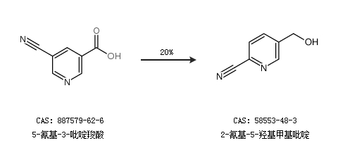 2.通过5-氰基-3-吡啶羧酸合成2-氰基-5-羟基甲基吡啶,收率约20%;
