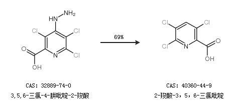1.通过3,5,6-三氯-4-肼吡啶-2-羧酸合成2-羧酸-3,5,6-三氯吡啶,收率约69%;