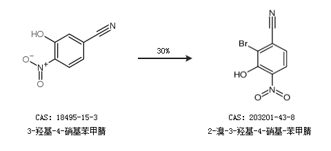 1.通过3-羟基-4-硝基苯甲腈合成2-溴-3-羟基-4-硝基-苯甲腈,收率约34%;