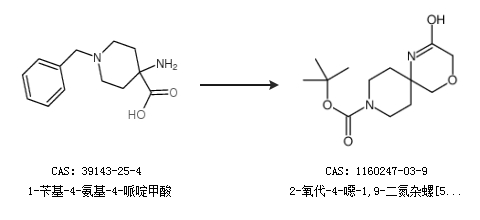1.通过1-苄基-4-氨基-4-哌啶甲酸合成2-氧代-4-噁-1,9-二氮杂螺[5.5]十一烷-9-羧酸 1,1-二甲基乙酯