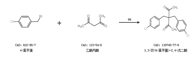 1.通过4-氯苄溴和乙酰丙酮合成3,3-双(4-氯苄基)-2,4-戊二酮,收率约9%;