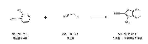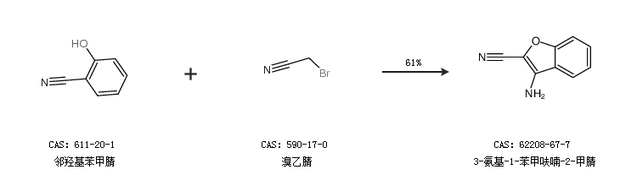 2.通过邻羟基苯甲腈和溴乙腈合成3-氨基-1-苯甲呋喃-2-甲腈,收率约61%;