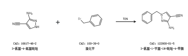 2.通过3-氨基-4-氰基吡唑和溴化苄合成3-氨基-1-苄基-1H-吡唑-4-甲腈,收率约72%;