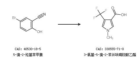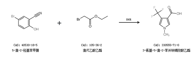 1.通过5-溴-2-羟基苯甲腈和溴代乙酸乙酯合成3-氨基-5-溴-2-苯并呋喃羧酸乙酯,收率约84%;