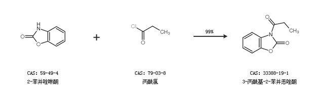 1.通过2-苯并唑啉酮和丙酰氯合成3-丙酰基-2-苯并恶唑酮,收率约99%;