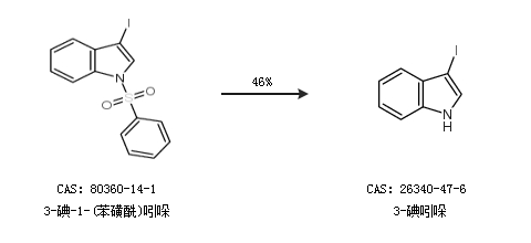 2.通过3-碘-1-(苯磺酰)吲哚合成3-碘吲哚,收率约46%;