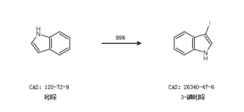 1.通过吲哚合成3-碘吲哚,收率约99%;