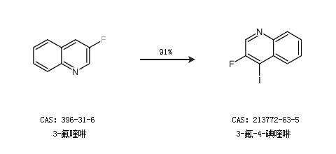 1.通过3-氟喹啉合成3-氟-4-碘喹啉,收率约91%;