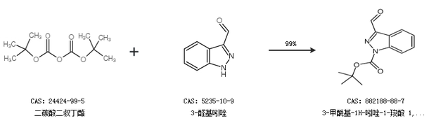 1.通过二碳酸二叔丁酯和3-醛基吲唑合成3-甲酰基-1H-吲唑-1-羧酸 1,1-二甲基乙酯,收率约99%;