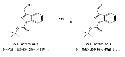 2.通过3-(羟基甲基)-1H-吲唑-1-羧酸,1,1-二甲基乙酯合成3-甲酰基-1H-吲唑-1-羧酸 1,1-二甲基乙酯,收率约71%;