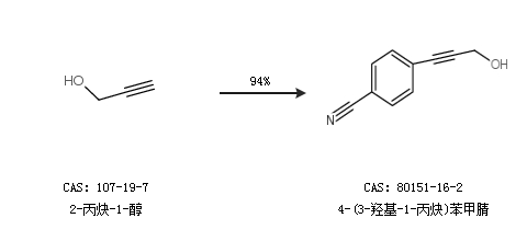 2.通过4-碘氰基苯和2-丙炔-1-醇合成4-(3-羟基-1-丙炔)苯甲腈,收率约93%;
