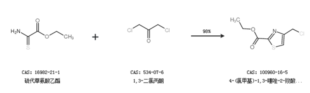 1.通过硫代草氨酸乙酯和1,3-二氯丙酮合成4-(氯甲基)-1,3-噻唑-2-羧酸乙酯,收率约98%;