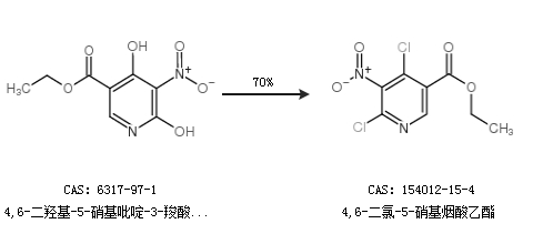 1.通过4,6-二羟基-5-硝基吡啶-3-羧酸乙酯合成4,6-二氯-5-硝基烟酸乙酯,收率约70%;