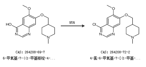 1.通过6-甲氧基-7-((1-甲基哌啶-4-基)甲氧基)喹唑啉-4(3h)-酮合成4-氯-6-甲氧基-7-[(1-甲基-4-哌啶基)甲氧基]-喹唑烷,收率约95%;