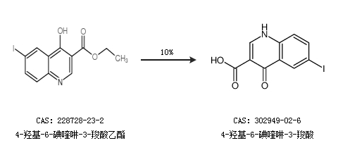 1.通过4-羟基-6-碘喹啉-3-羧酸乙酯合成4-羟基-6-碘喹啉-3-羧酸,收率约10%;