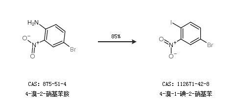 1.通过4-溴-2-硝基苯胺合成4-溴-1-碘-2-硝基苯,收率约85%;