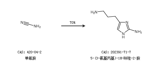1.通过单氰胺合成5-(3-氨基丙基)-1H-咪唑-2-胺,收率约70%;