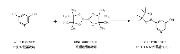 1.通过3-溴-5-羟基吡啶和联硼酸频那醇酯合成5-(4,4,5,5-四甲基-1,3,2-二噁硼烷-2-基)吡啶-3-醇