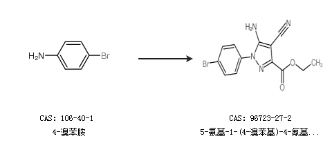 1.通过4-溴苯胺合成5-氨基-1-(4-溴苯基)-4-氰基吡唑-3-羧酸乙酯