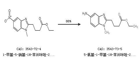 1.通过1-甲基-5-硝基-1H-苯并咪唑-2-丁酸乙酯合成5-氨基-1-甲基-1H-苯并咪唑-2-丁酸乙酯,收率约88%;