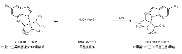 1.通过5-溴-1-三异丙基硅烷-1H-吡咯并[2,3-b]吡啶和甲基溴化镁合成5-甲基-1-[三(1-甲基乙基)甲硅烷基]-1H-吡咯并[2,3-b]吡啶,收率约60%;