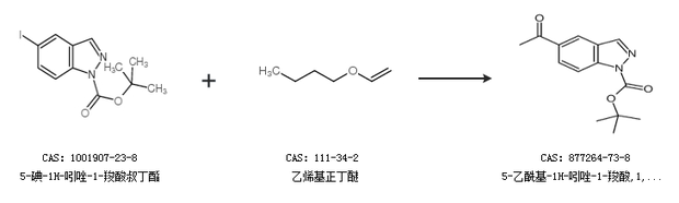 1.通过5-碘-1H-吲唑-1-羧酸叔丁酯和乙烯基正丁醚合成5-乙酰基-1H-吲唑-1-羧酸,1,1-二甲基乙酯