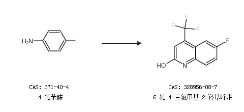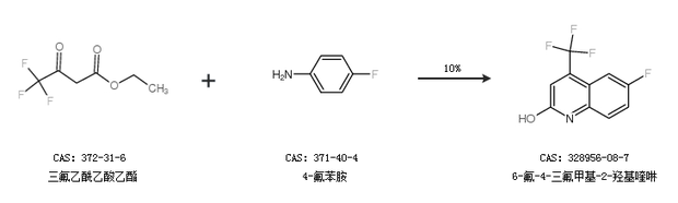 2.通过三氟乙酰乙酸乙酯和4-氟苯胺合成6-氟-4-三氟甲基-2-羟基喹啉,收率约10%;
