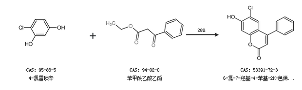 1.通过4-氯雷琐辛和苯甲酰乙酸乙酯合成6-氯-7-羟基-4-苯基-2H-色烯-2-酮,收率约28%;