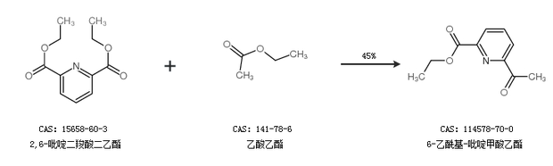 1.通过2,6-吡啶二羧酸二乙酯和乙酸乙酯合成6-乙酰基-吡啶甲酸乙酯,收率约45%;
