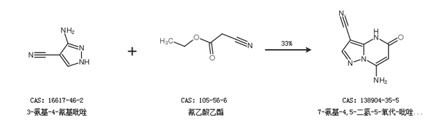 1.通过3-氨基-4-氰基吡唑和氰乙酸乙酯合成7-氨基-4,5-二氢-5-氧代-吡唑并[1,5-a]嘧啶-3-甲腈,收率约33%;