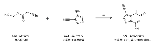 2.通过氰乙酸乙酯和3-氨基-4-氰基吡唑合成7-氨基-4,5-二氢-5-氧代-吡唑并[1,5-a]嘧啶-3-甲腈,收率约34%;