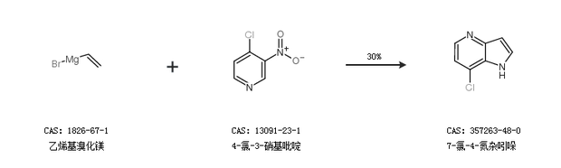 1.通过乙烯基溴化镁和4-氯-3-硝基吡啶合成7-氯-4-氮杂吲哚,收率约30%;