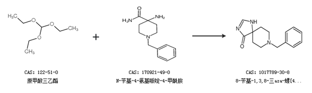 1.通过原甲酸三乙酯和N-苄基-4-氨基哌啶-4-甲酰胺合成8-苄基-1,3,8-三aza-螺[4.5]-1-癸烯-4-酮