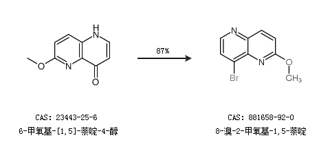 1.通过6-甲氧基-[1,5]-萘啶-4-醇合成8-溴-2-甲氧基-1,5-萘啶,收率约87%;