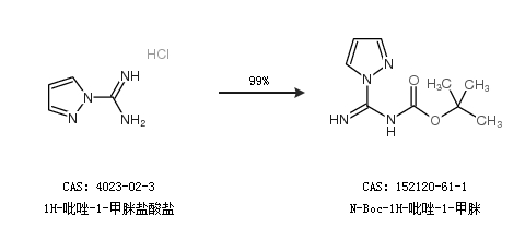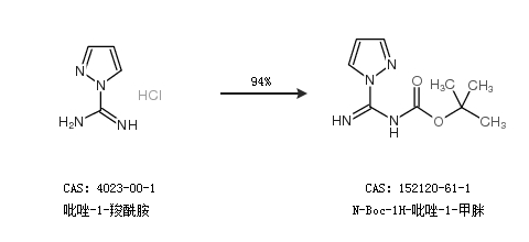 1.通过1H-吡唑-1-甲脒盐酸盐合成N-Boc-1H-吡唑-1-甲脒,收率约99%;