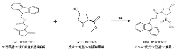 2.通过9-芴甲基-N-琥珀酰亚胺基碳酸酯和反式-4-羟基-L-脯氨酸甲酯合成N-Fmoc-反式-4-羟基-L-脯氨酸甲酯,收率约86%;